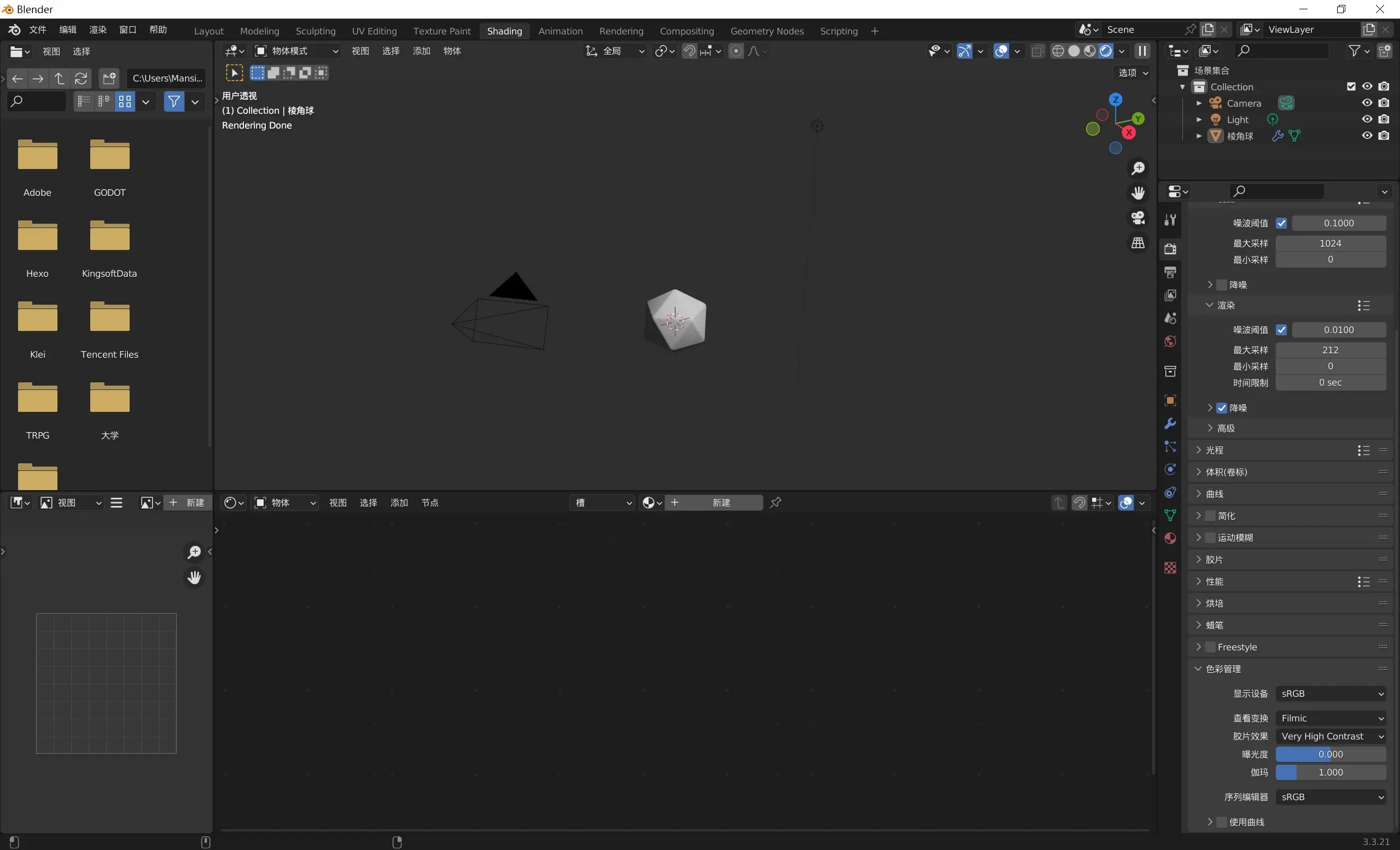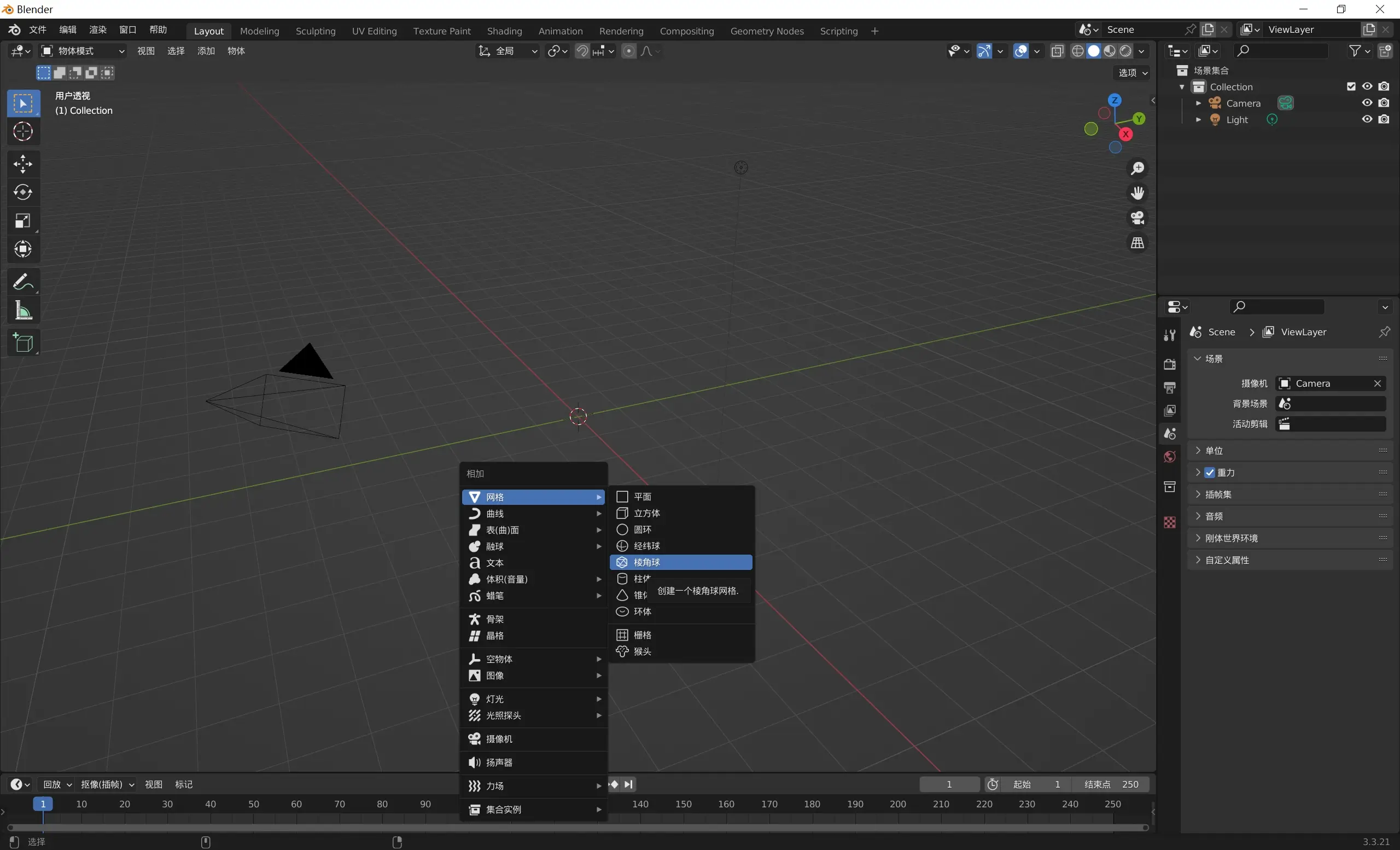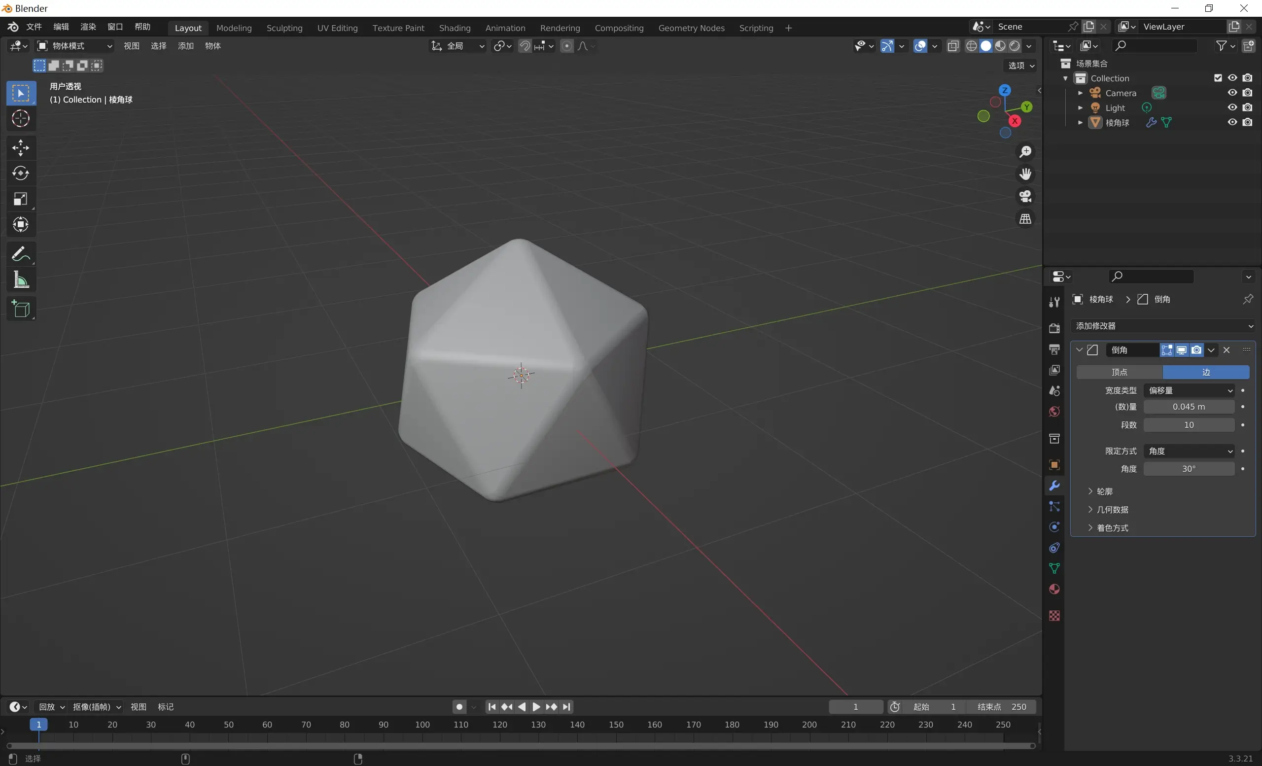 创建几何体本身倒是挺简单,直接 Shift + A 就可以在 网格-棱角球 里创建一个几何体,将细分修改为 1,就是二十面体了。